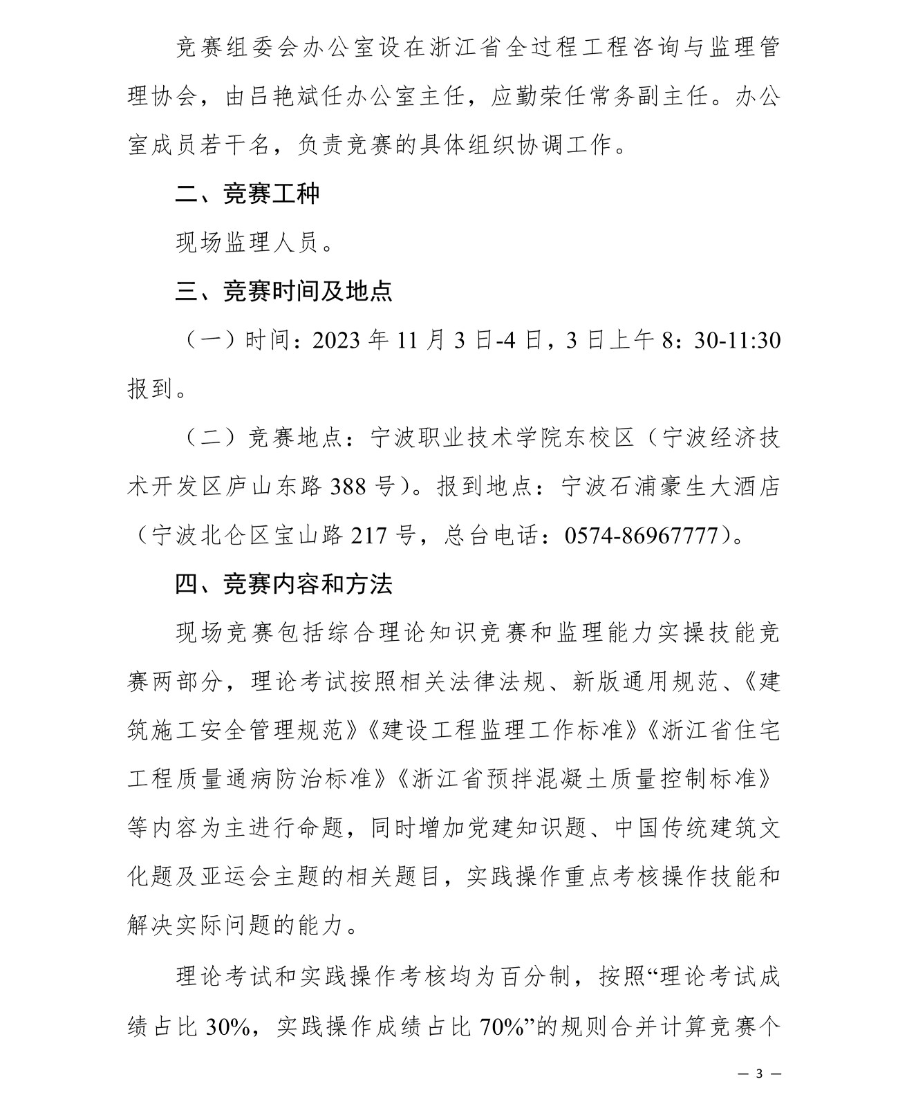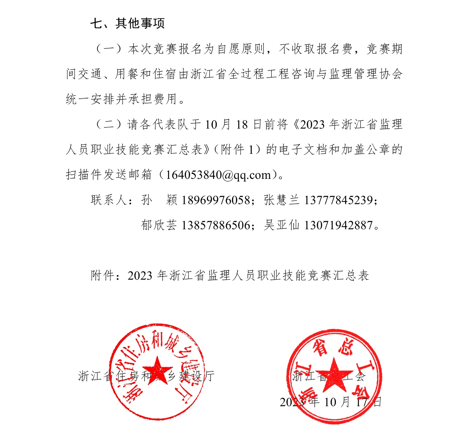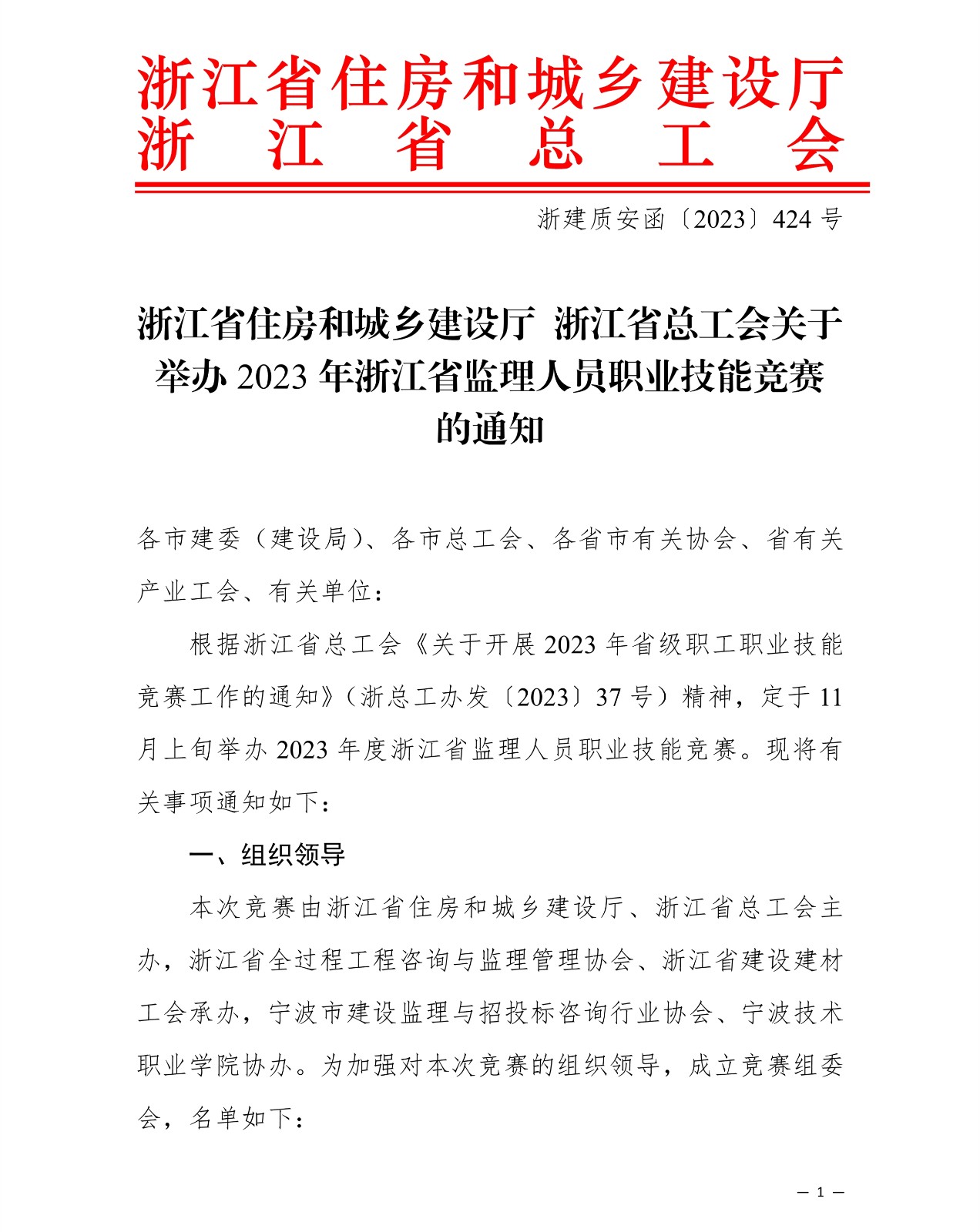 浙江省住房和城鄉建設廳 浙江省總工會關于舉辦 2023 年浙江省監理人員職業技能競賽的通知